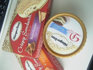 求めているものが無いことを知って半ばヤケクソでハーゲンダッツのクリスピーサンド2つとドルチェのティラミスの計3つを購入。